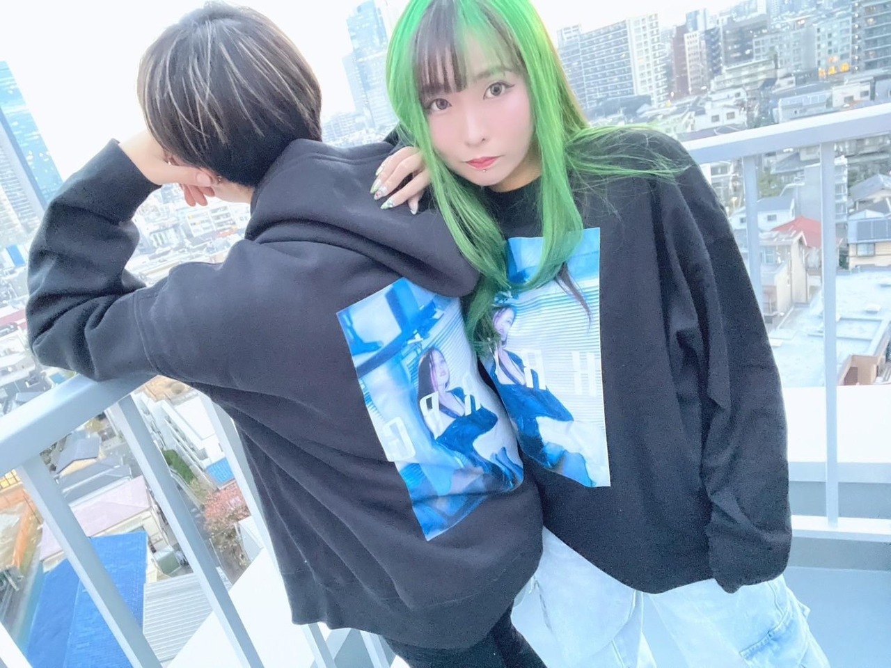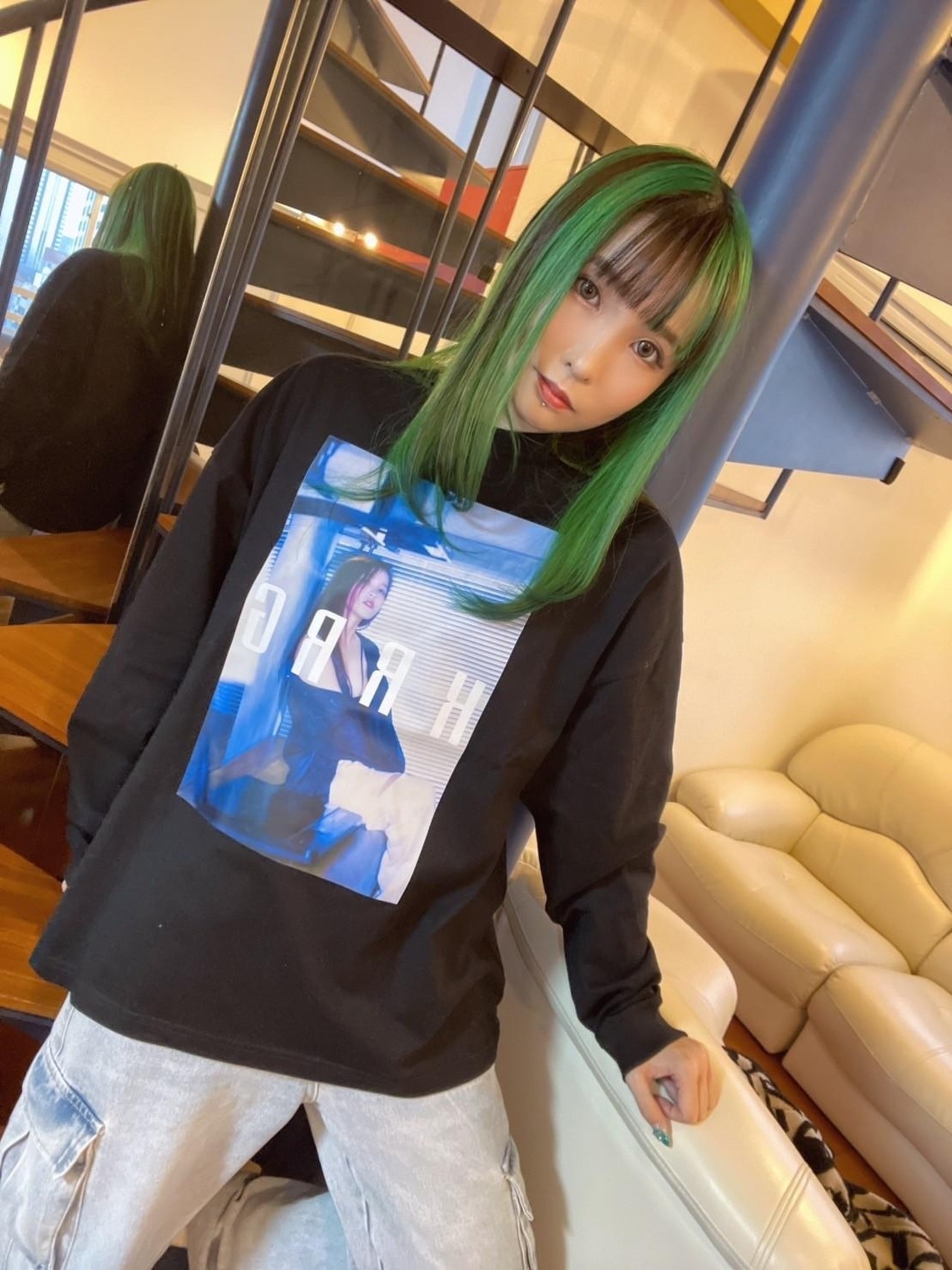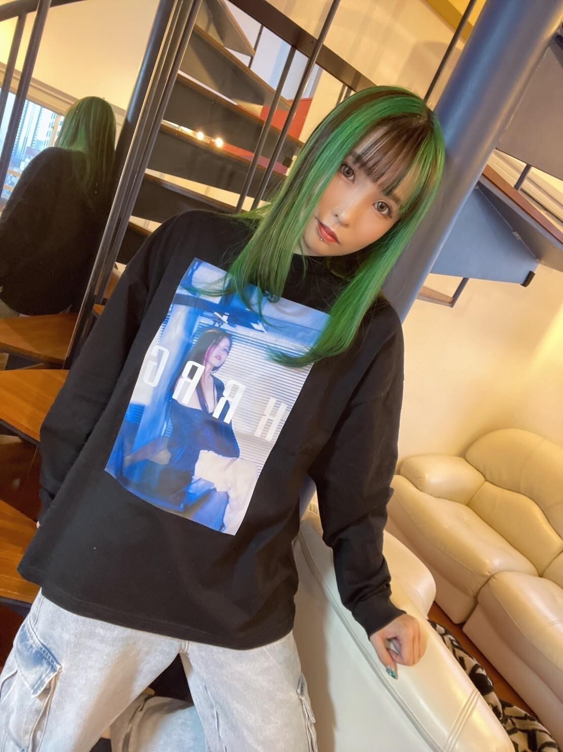 作品内で見せる顔とは一味違う大人っぽいスタイルで撮影した"枢木あおい"さんを、ブラックボディの長袖Tシャツにプリントしました。